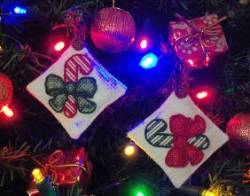 This pair of cross stitch Christmas ornaments features a red and a green candy cane tied with ribbons. They're "Ornament Minis." "Done-in-a-day cross stitch." "Weekend Wonders." No matter what they're called, these miniature decorations are big on impact.