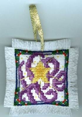 I embroidered the Hope Christmas ornament on 14-count Aida cloth with DMC 6-strand cotton floss and accented it with gold Kreinik Metallic floss. The front and back are stitched on two separate squares, then joined using half stitches. It is highlighted with padding, gold ribbon hanger and surrounding fringe.